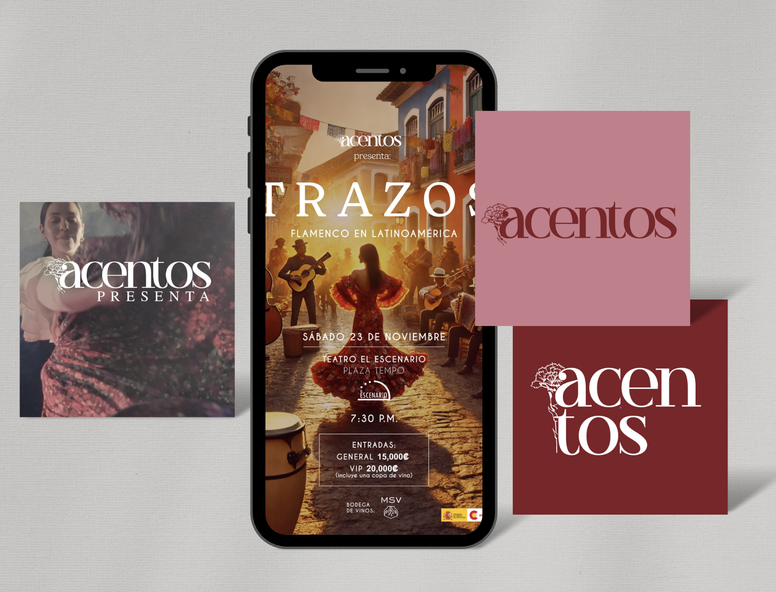 Acentos is a flamenco show concept led by Allan Naranjo that blends traditional flamenco with diverse musical genres. The challenge was to create a visual identity that captured both the elegance and the innovative spirit of the performance. The solution was a refined logo featuring elegant typography and a color palette that evokes the passion of flamenco while embracing its fusion with other styles. This identity played a key role in the show’s promotion, helping attract a broad and culturally curious audience.